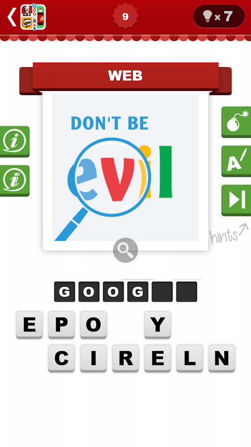 Ta aplikacja to mocno wciągająca zabawa w zgadywanie nazw marek na podstawie logotypów lub ich fragmentów). Na początku jest bardzo łatwo. Całe logo marki typu Skype czy Mercedes nie nastręcza wiele trudności z odgadnięciem nazwy. W razie problemów można liczyć na podpowiedzi. Bardzo wartościowe jest też pojawienie się krótkiej informacji o danej marce po odgadnięciu.