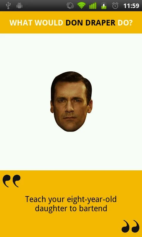 Podejrzewam, że najbardziej znaną postacią świata reklamy jest obecnie fikcyjny Don Draper z serialu Mad Man. Dla wszystkich fanów telewizyjnego show dostępna jest śmieszkowa aplikacja What Would Don Draper Do?. Jest to raczej apka typu użyj raz i zapomnij – po kliknięciu na twarz Drapera lub potrząśniciu telefonem pojawia się jeden jego cytat. Ale czasami w trudnych momentach warto sobie o niej przypomnieć – na przykład żeby się odstresować albo spojrzeć na nasz marketingowy problem z dystansem 😉